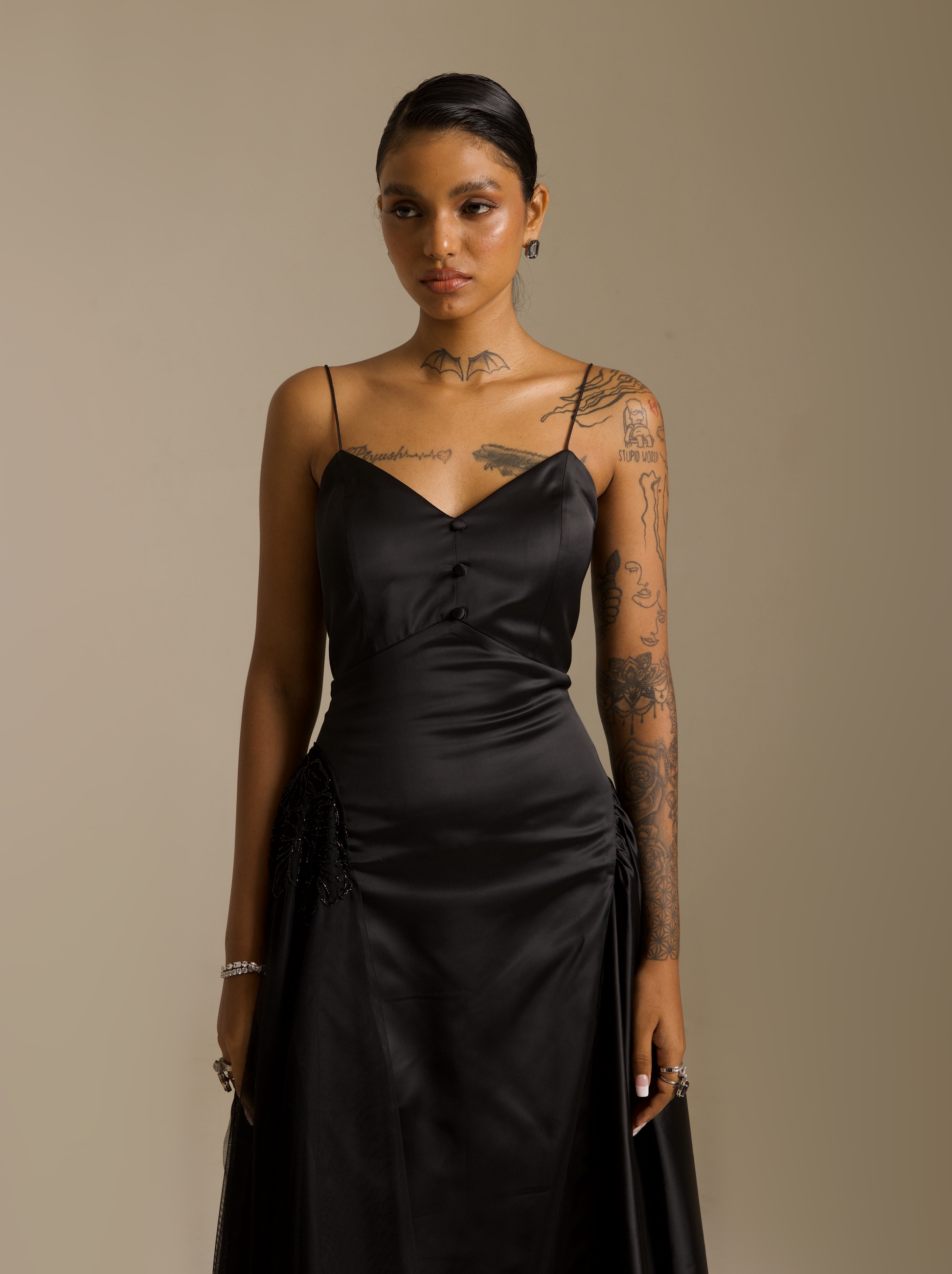 A timeless vision of sensual elegance and modern allure, this black satin hourglass dress is designed to celebrate bold femininity with effortless sophistication. Crafted from luxurious satin, it features a sleek, body-skimming silhouette enhanced by delicate spaghetti straps and a soft sweetheart neckline. A touch of romance is revealed with an embellished embroidered net hem that peeks subtly with every step, creating graceful movement and intrigue. Whether styled for an elegant soirée or a statement dinner, this dress is made to captivate and command attention.